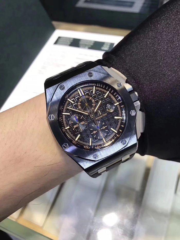 在和大家讨论爱彼手表收藏价值这个问题之前,让我们先来简单了解一下这款手表的基本信念信息,这款非常适合男士佩戴的手表编号为26564IC.OO.D002CR.01,属于爱彼传统系列,并且全球限量发行十件。由钛合金制成的表壳直径为47mm,厚度为12.3mm,银灰色表盘搭配黑色鳄鱼皮表带和折叠式18k玫瑰金表扣,18k白金表冠,蓝宝石水晶玻璃表镜。手表采用爱彼制造型号为Cal.2874的自动机械机芯,直径为29.9mm,一共由38颗宝石和48个零件制成。机芯振频每小时21600,可以为手表提供50小时的动力存储,具有计时,陀飞轮和三问功能。